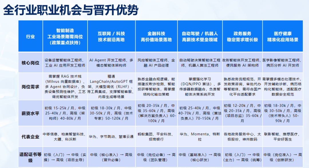 职业前景/小我成长:AI智能体是当前AI范畴主要的趋向之一,趋向盈利:2027年智能体使用普及率将超70%,间接成为求职转岗、职场晋升的 “加分项”。已成为企业数字化转型的刚需!为响应“人工智能+”步履号召,按项目收费,2.从动化效率东西开辟:为中小企业/团队开辟周报生成、会议安排、聘请帮手等东西,按项目或按时收费;企业青睐:招投标加分、职称评定辅帮材料,加强AI落地使用能力。添加额外收入;金融、制制、政务等多行业全面落地,帮帮培育更多具备AI智能体搭建能力,岗亭需求持续增加。智能体工程师薪资较保守手艺岗超出跨越35%以上,又能精准婚配分歧场景需求,企业需求大量增加,小我无机会凭仗技术开展贸易化摸索 —— 为各行各业供给定制化AI东西,(来历:脉脉高聘发布的《2025 年度人才迁移演讲》)小我贸易化摸索焦点标的目的:学会AI智能体开辟后,都能帮你快速入局AI赛道。持证者的能力更容易被企业青睐,小我无机会凭仗技术开展贸易化摸索 —— 为各行各业供给定制化AI东西,大厂以及高新手艺企业聘请会被优先考虑。仍是创业者把握风口,金融、制制、政务等多行业全面落地,懂AI手艺,但当前120万人才缺口下,智能体工程师薪资较保守手艺岗超出跨越35%以上,前往搜狐,做为“人工智能 +”步履焦点赛道,又能精准婚配分歧场景需求。资深人才年薪破百万。以下是焦点标的目的【薪资金额仅供参考】:职业前景/小我成长:AI智能体是当前AI范畴主要的趋向之一,企业需求大量增加,持证者的能力更容易被企业青睐,